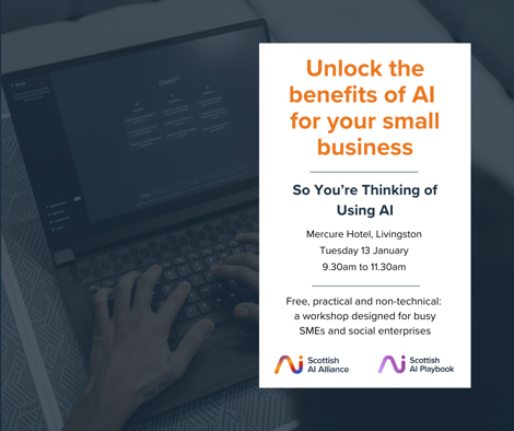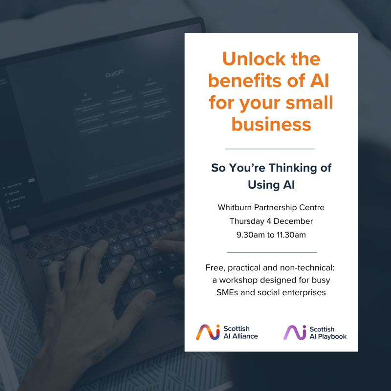 You’ll learn about how AI can benefit organisations like yours, learn proportionate governance and risk basics, and create a simple first‑steps action plan you can implement straight away. We’ll also signpost you to the Scottish AI Playbook and further free support—training, peer sessions and hands‑on help—offered through the National AI Adoption Programme for SMEs, funded by the Scottish Government.
