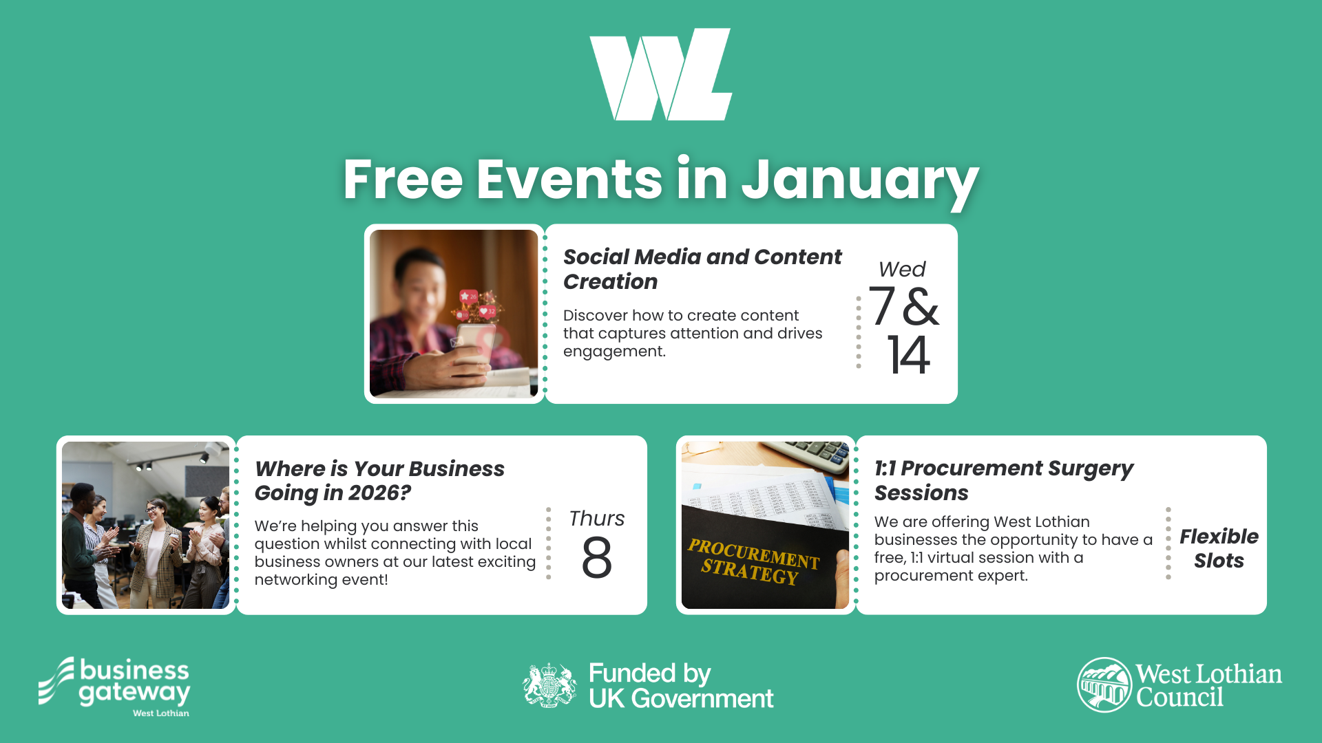 We’re starting the New Year with a bang with our first networking event of the year! During this event, you will have the chance to connect with likeminded local business owners and hear from our fantastic guest speaker, Mark Douglas, who will be helping you review the current position of your business and plan for the year ahead. This is taking place on Thursday, the 8th of January 2026, from 9:30am – 11:30am, at Bathgate Golf Club.